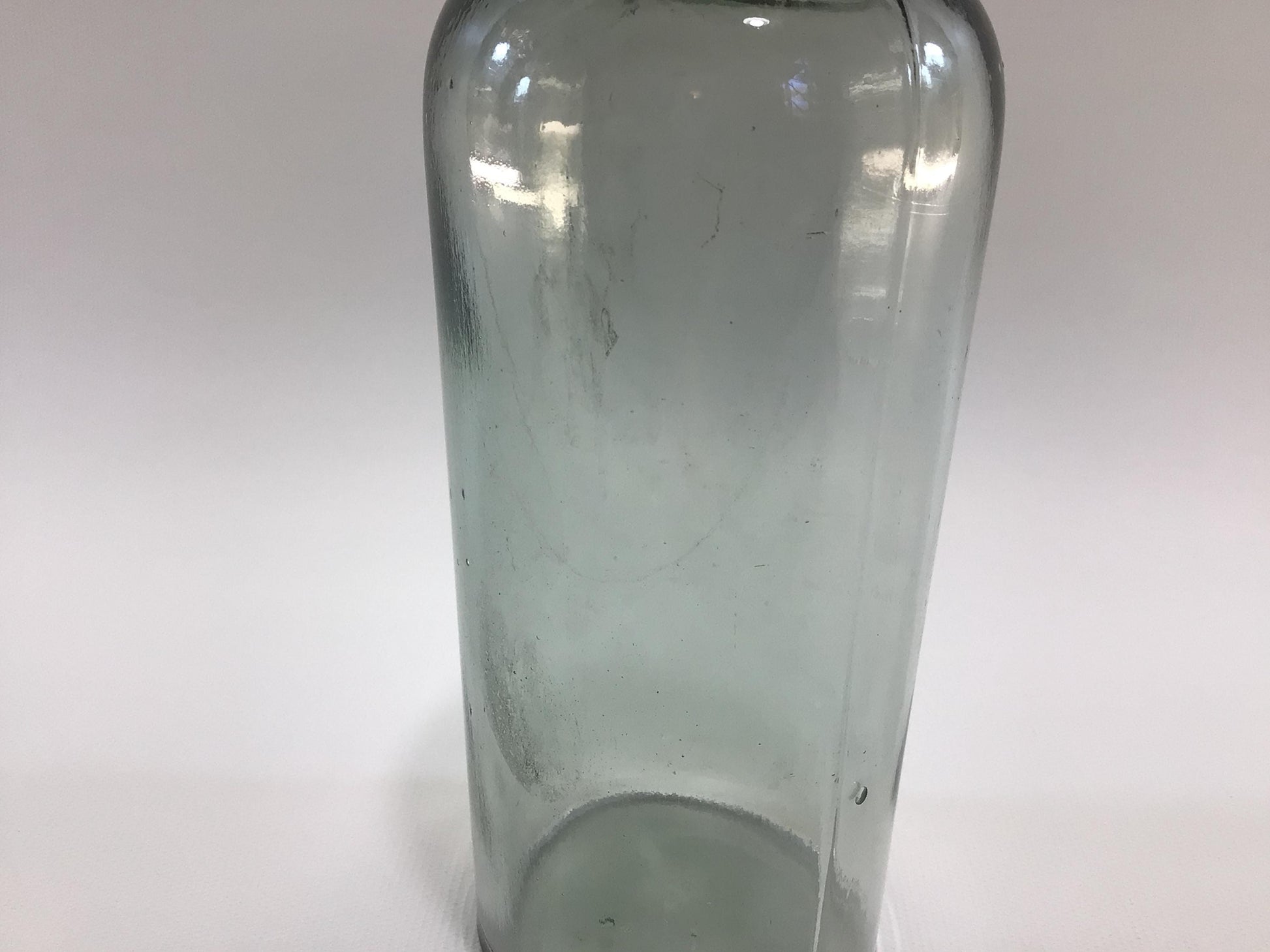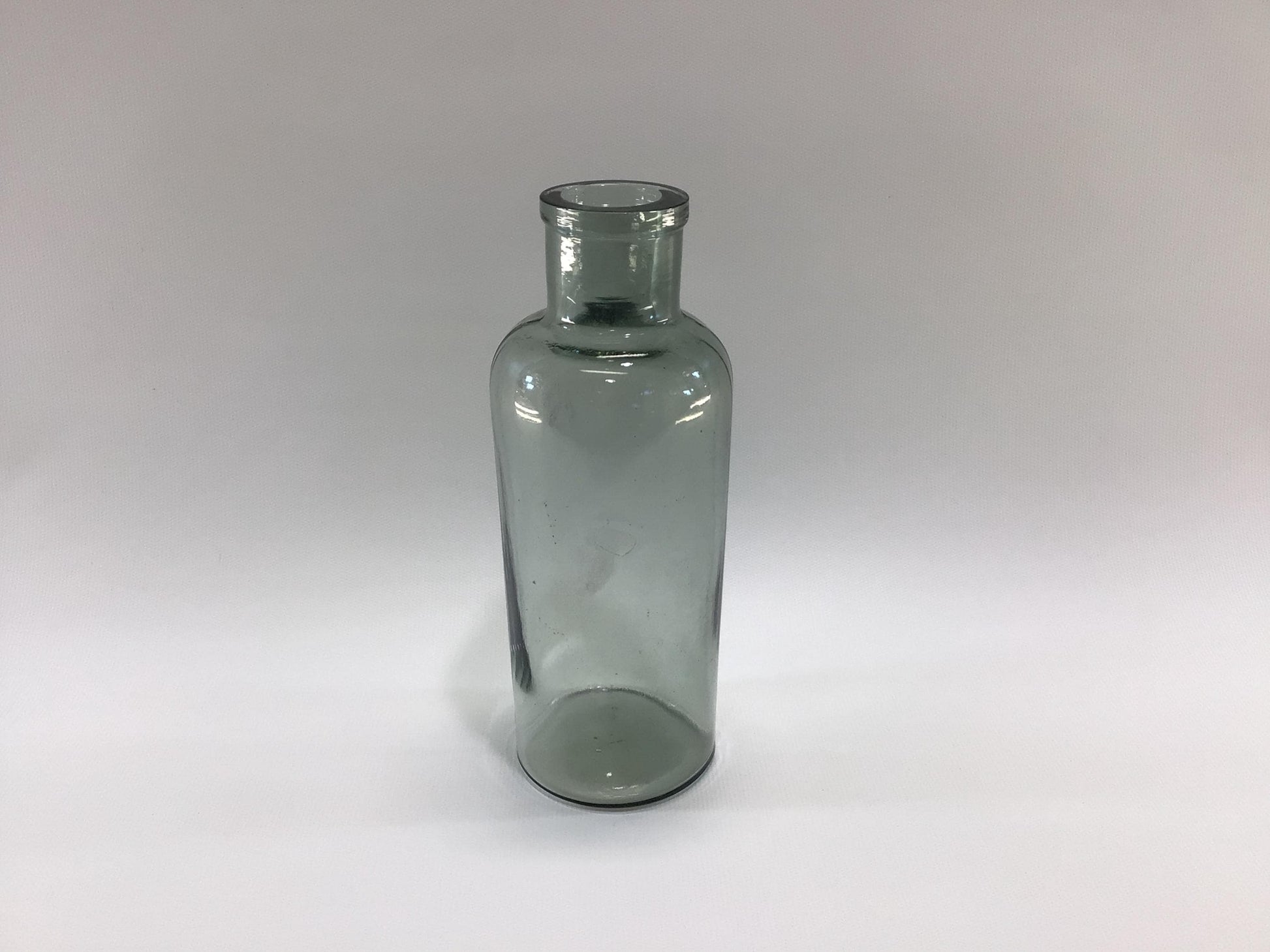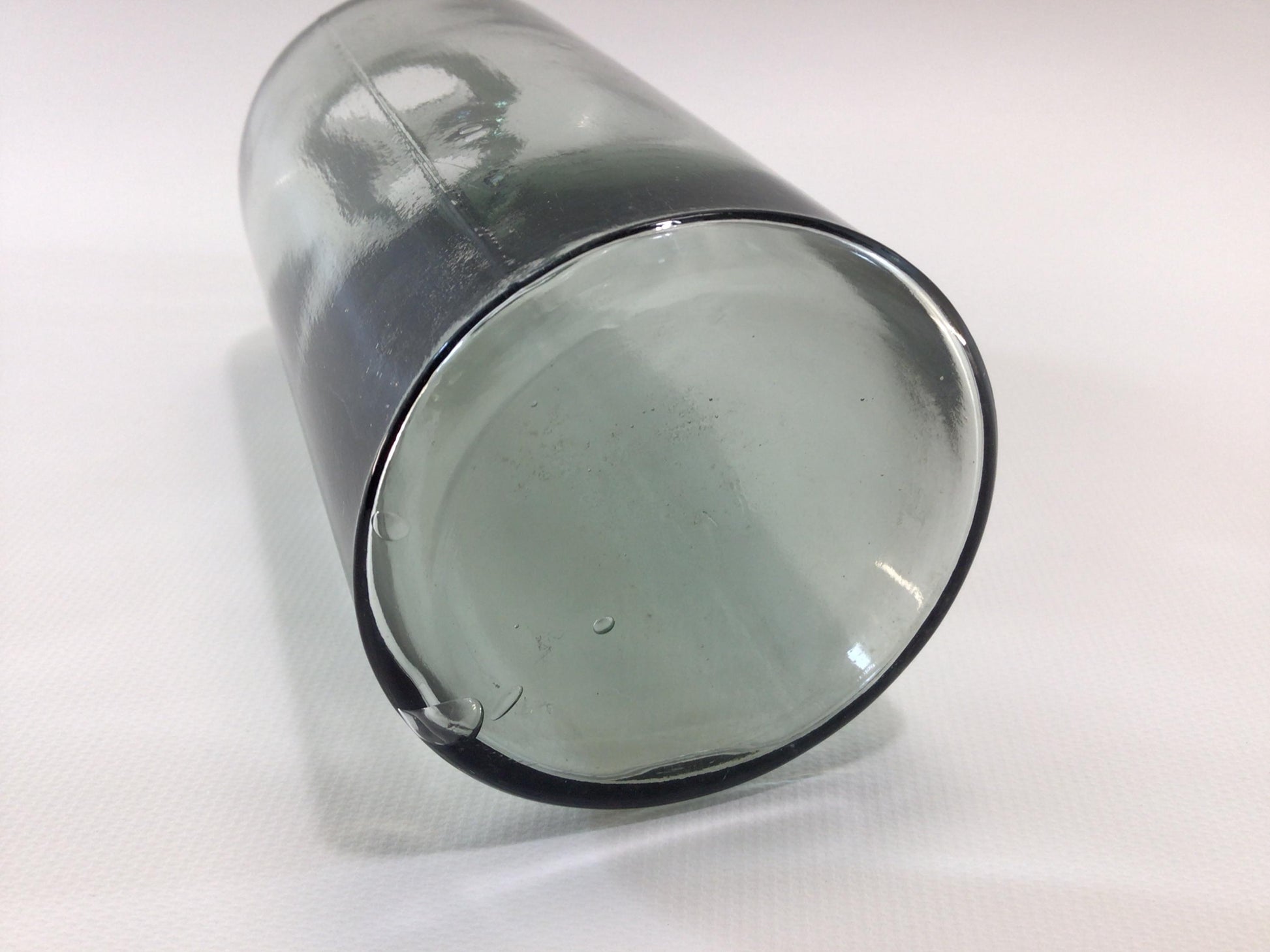 In good condition, has a small chip on its lip, neck is applied crooked. Measures approx. 7 1/2" high x 2 5/8" diameter. The color is blue, almost a smokey grey.