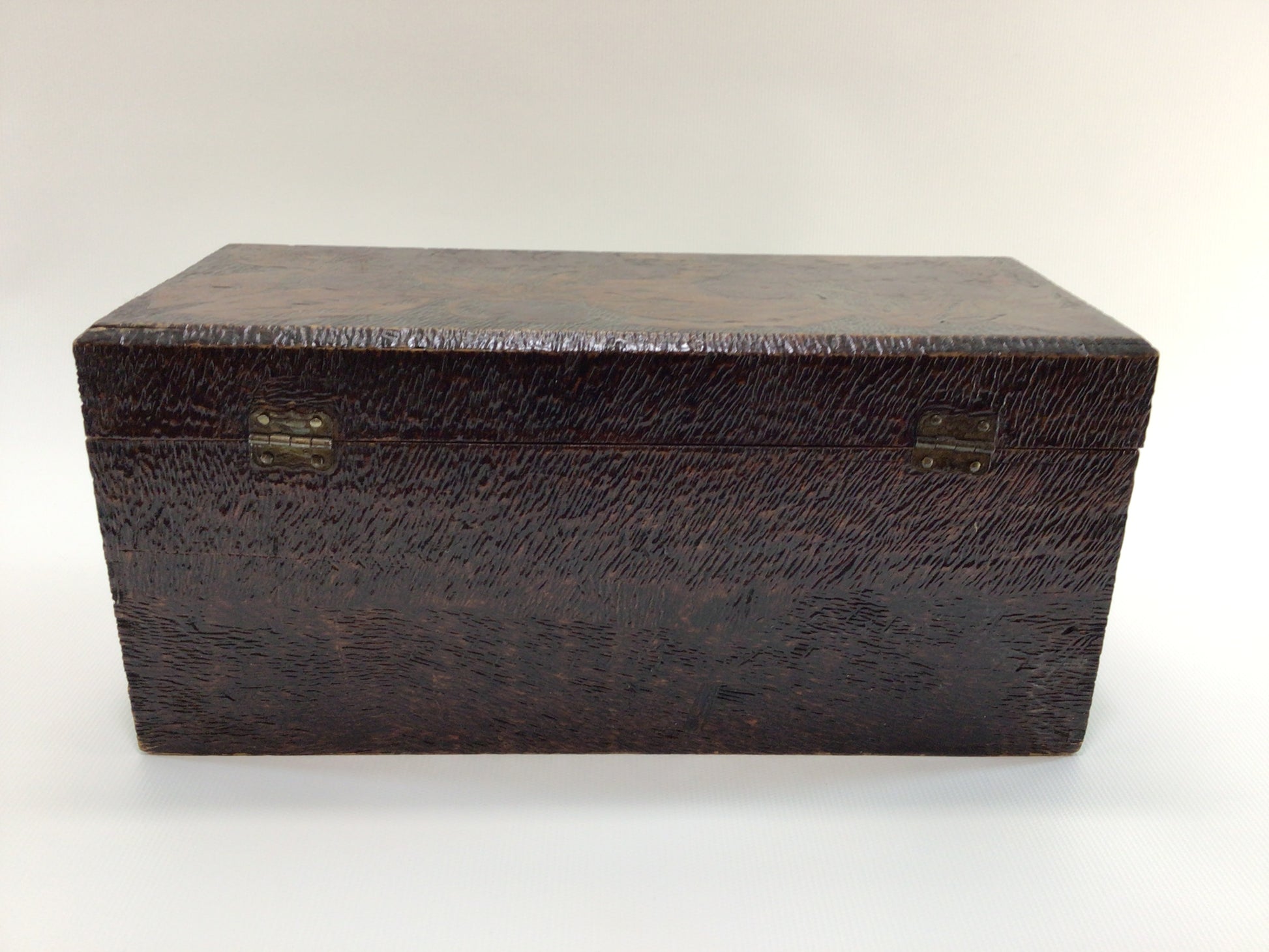 An old wooden glove box in fair condition, has use wear, scuffs and age patina.