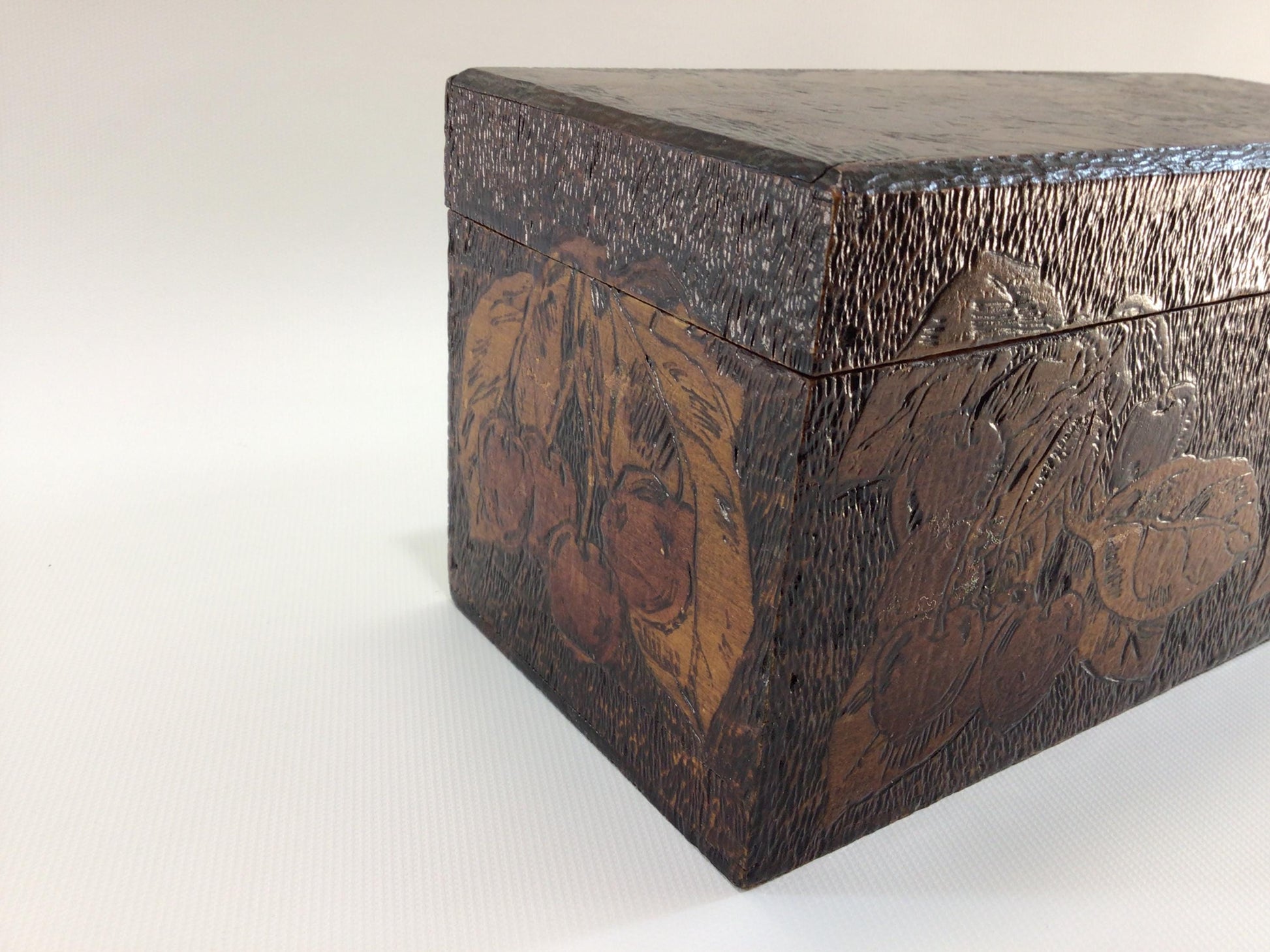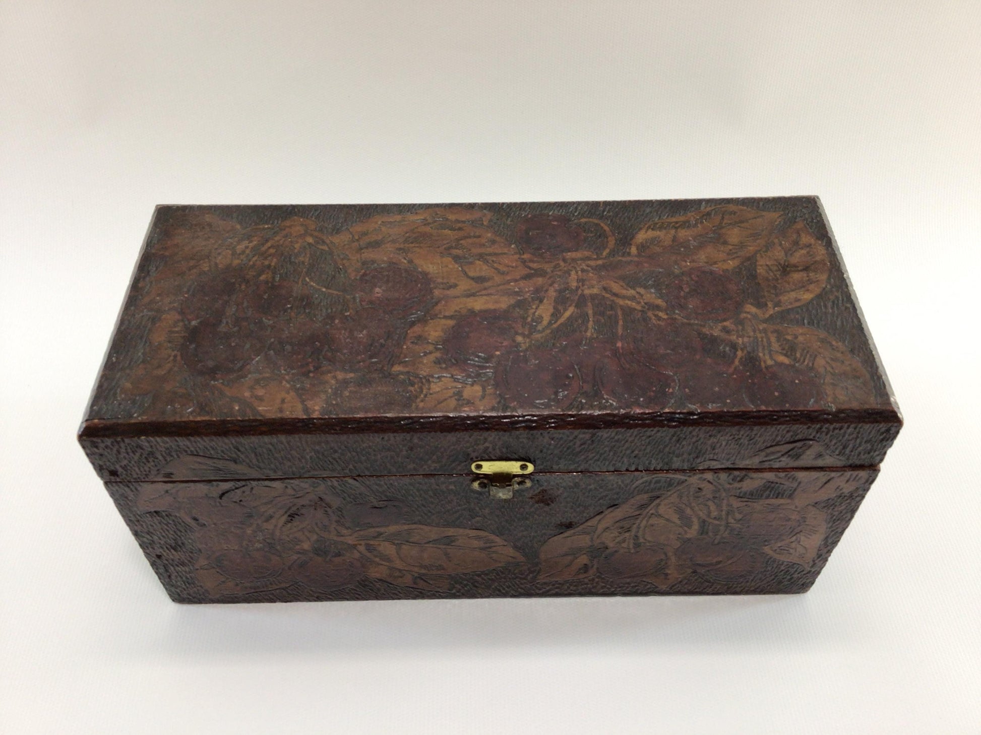 Antique Flemish Art Pyrography Glove Box Cherries Motif Rustic Home Decor Trinket Jewelry Storage Container