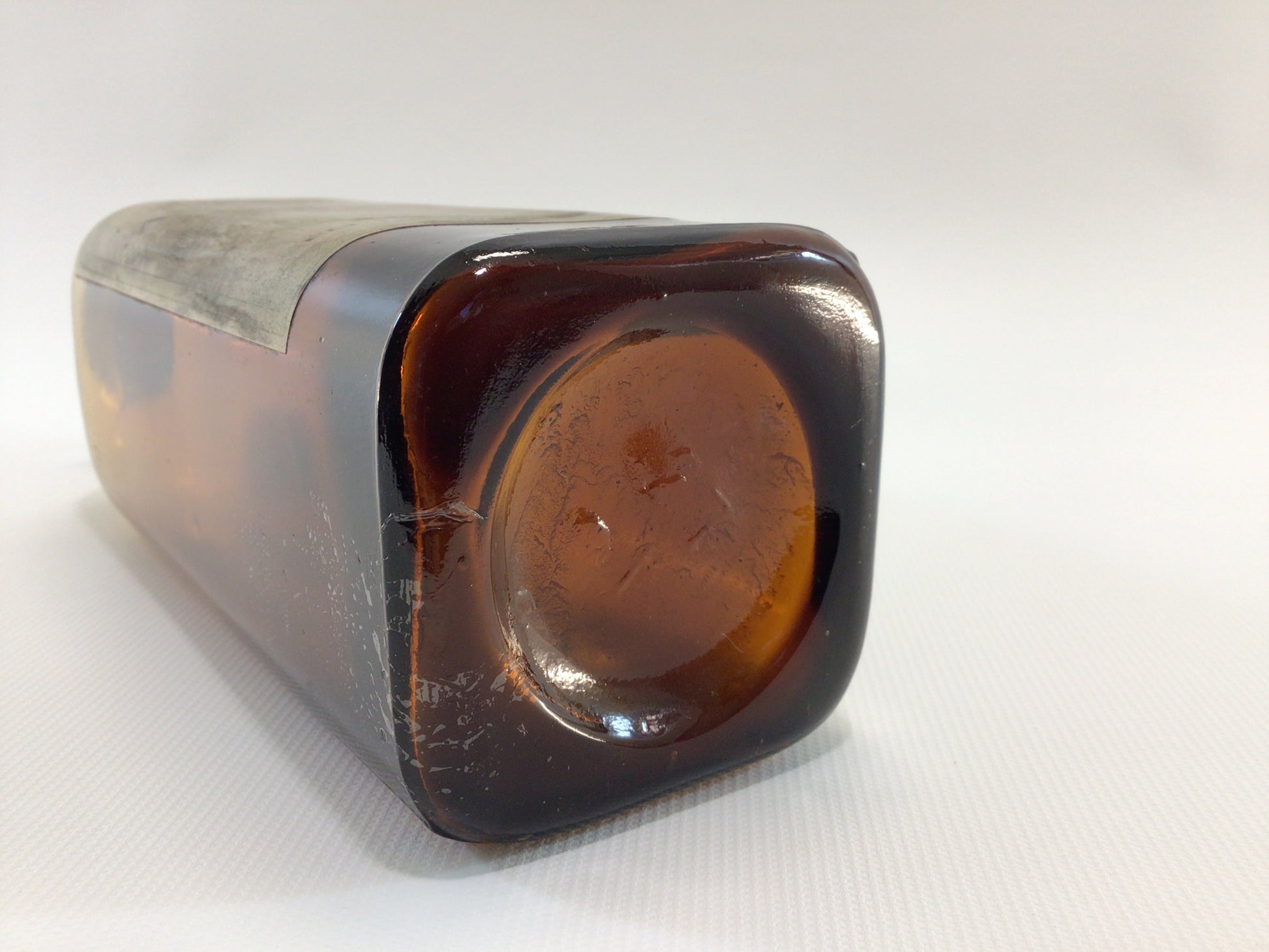 Bottle is in good condition, no chips, has some scuffs, stains and interior residue. Measures approx. 8 1/2" tall x 2 5/8" square.