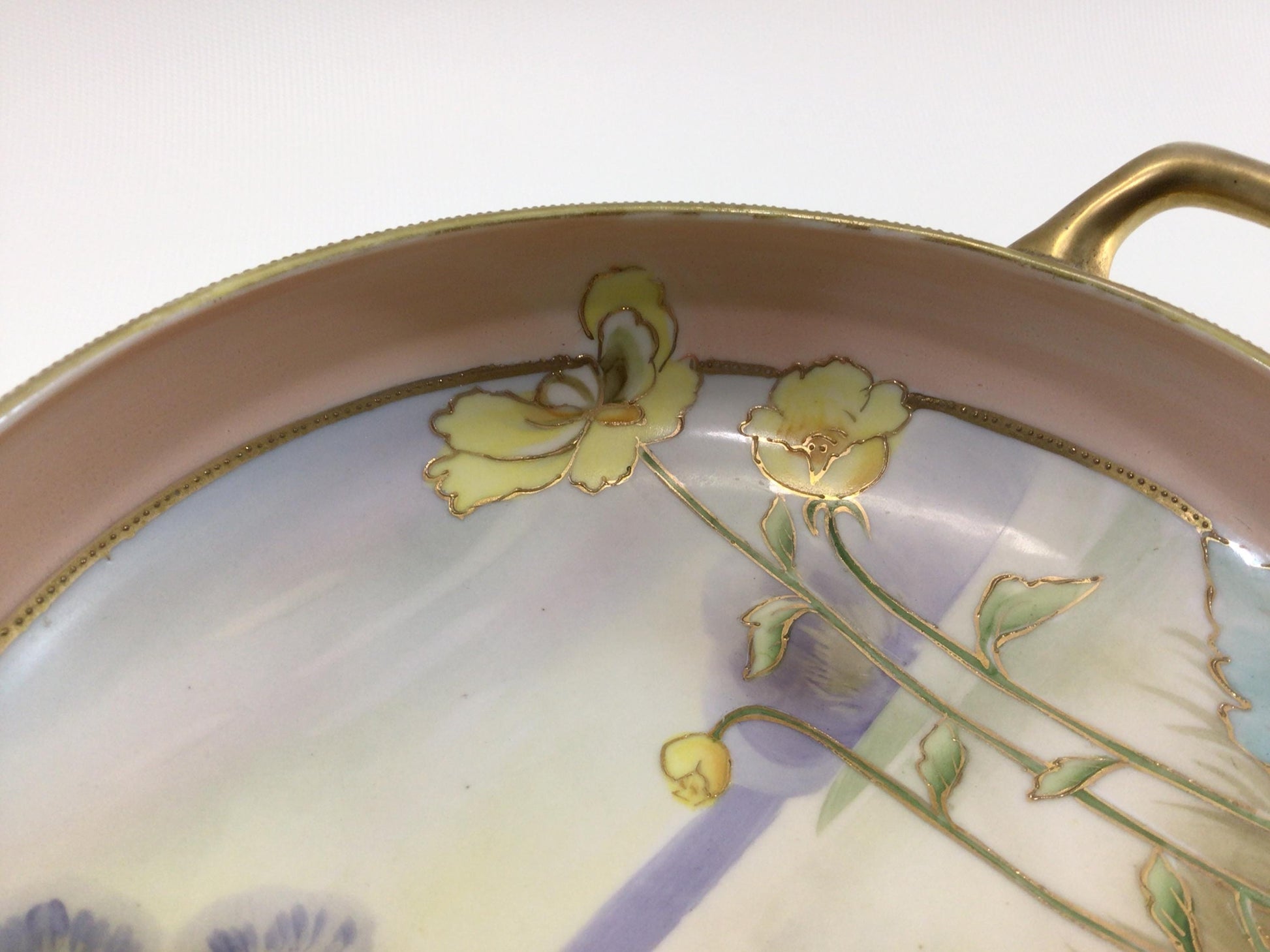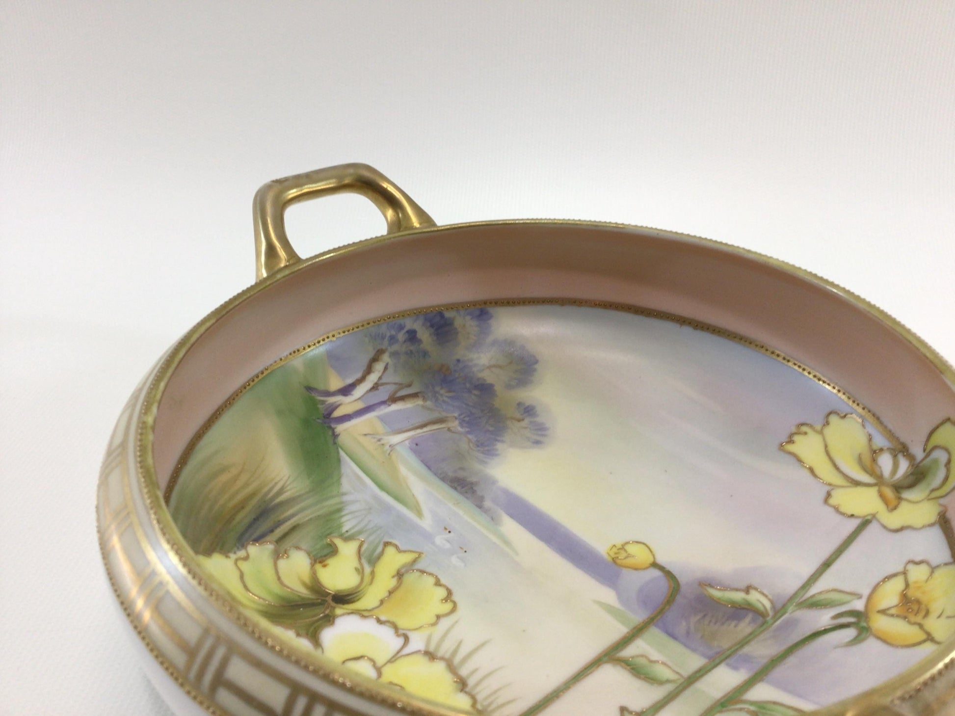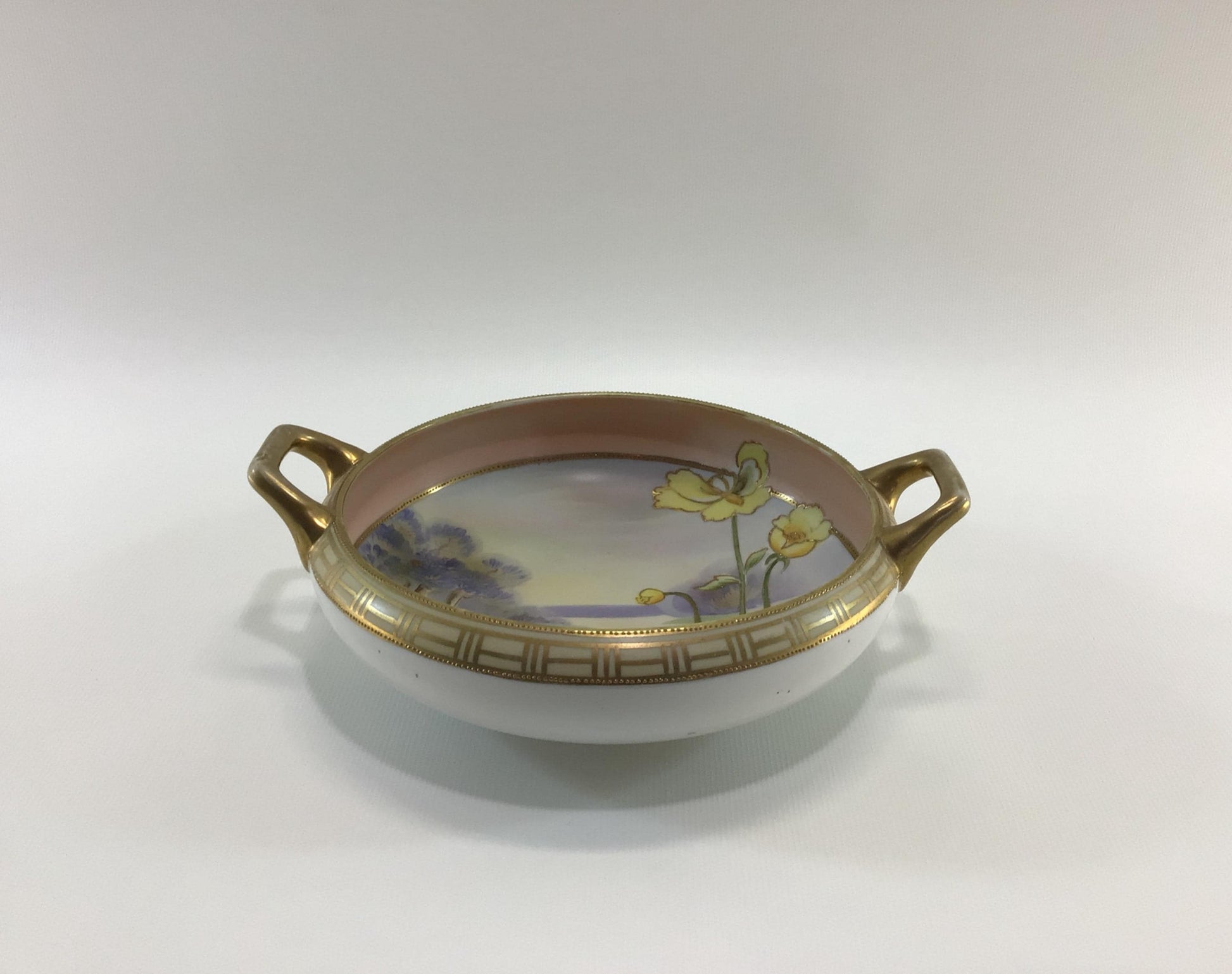 Bowl is in good condition, no chip or breaks, has considerable gold gilt loss on its handles from use wear, it could use a gentle cleaning. Measures approx. 2" high x 7" diameter.