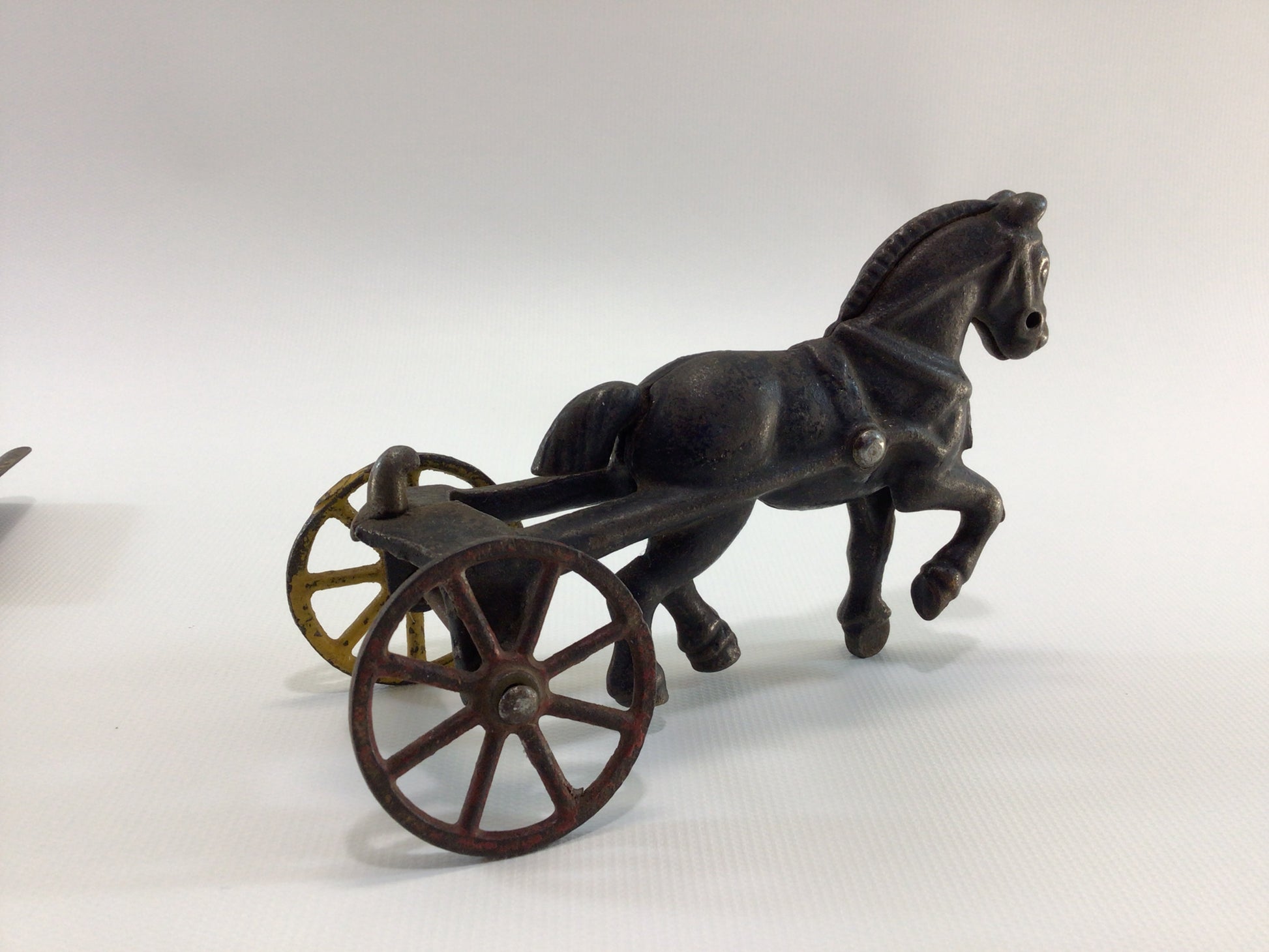 Horse is missing its reigns and and some wheel paint. The wagon is missing a lot of its paint and is bent out of shape. Measures approx. 10 3/4" long x 3 1/4" high x 3" wide.