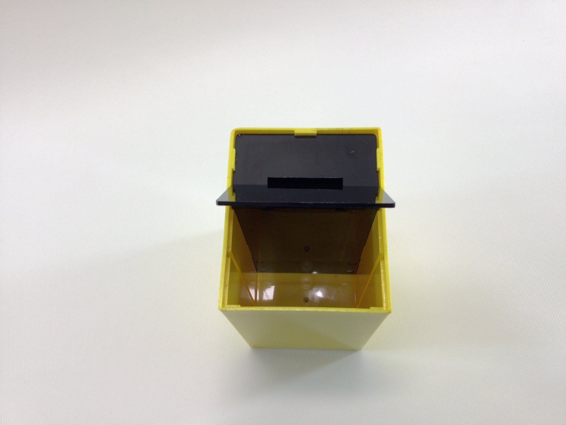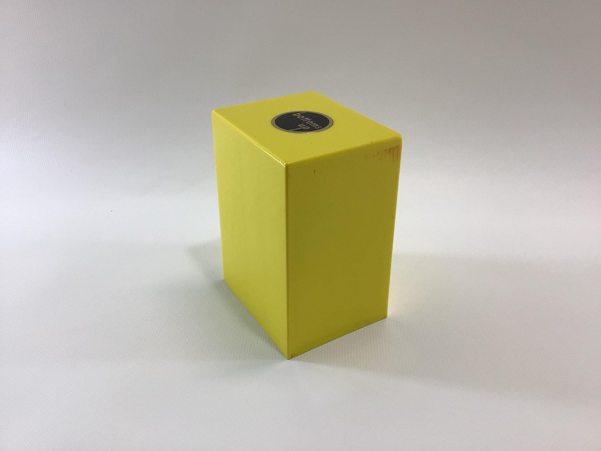 Bottoms Up Mid Century Novelty Storage Container Box Yellow and Black Hard Plastic Weighted Trap Door Bottom.