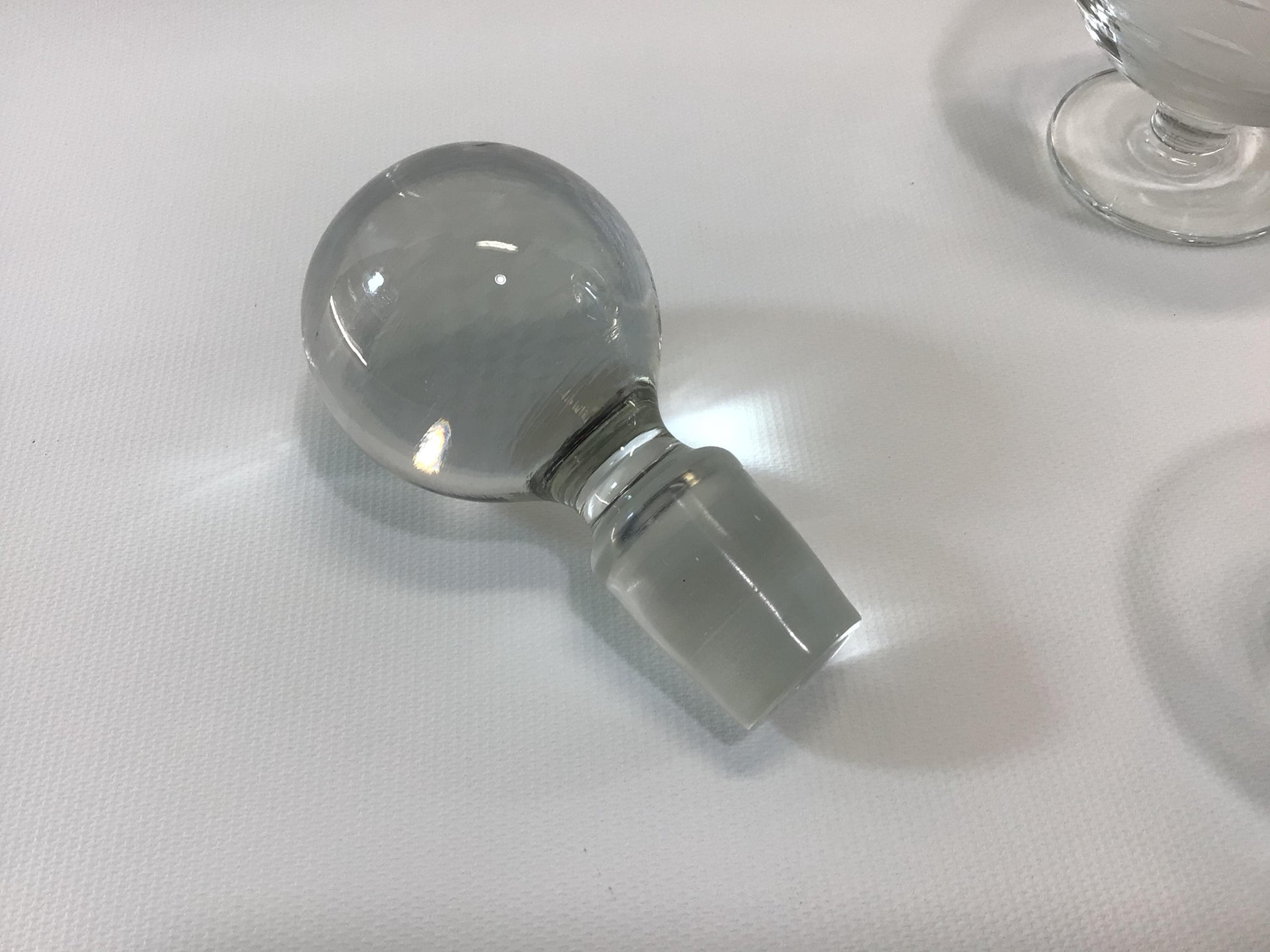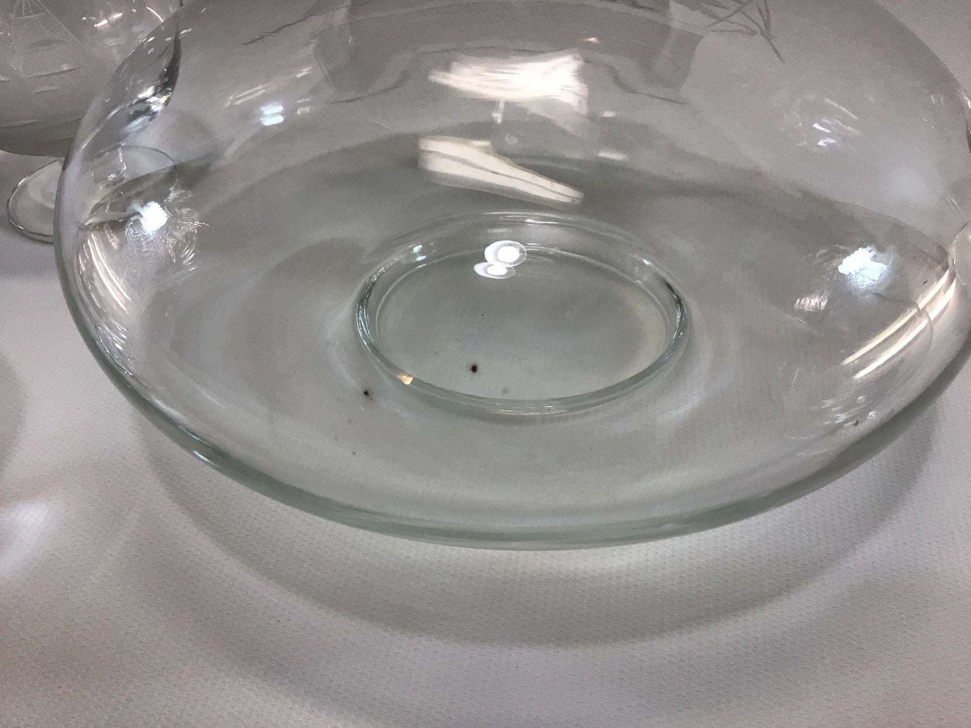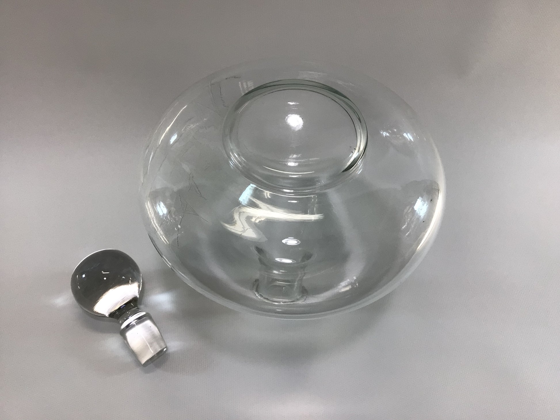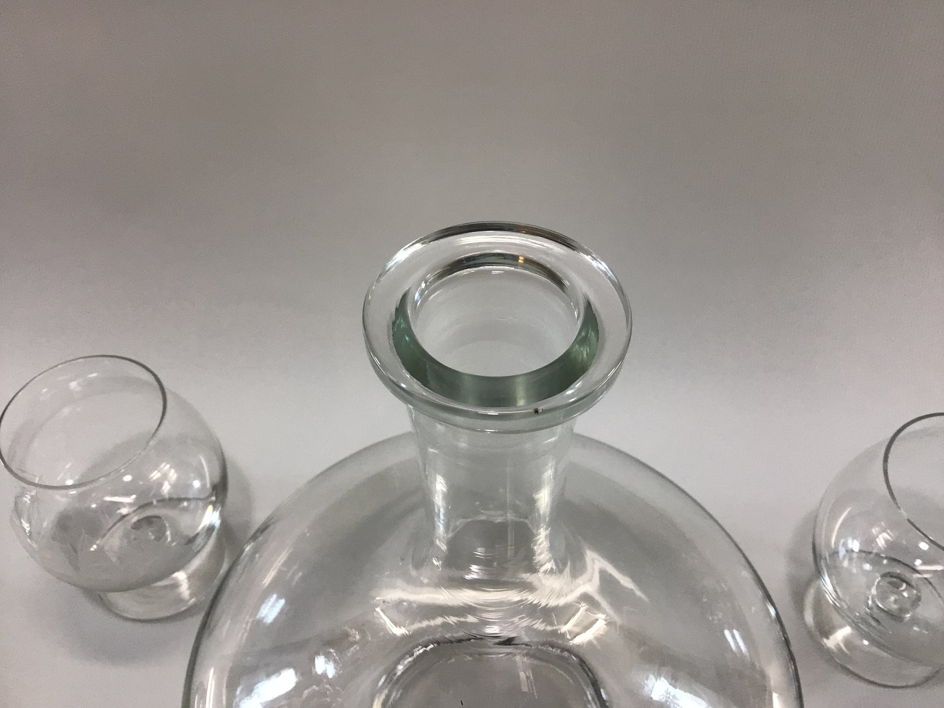 Set is in good condition, decanter has 2 small black spots on its interior ( unsure if their glass inclusion flaws), its lip has 1 flea bite chip. All 4 snifters are in good condition, no chips.