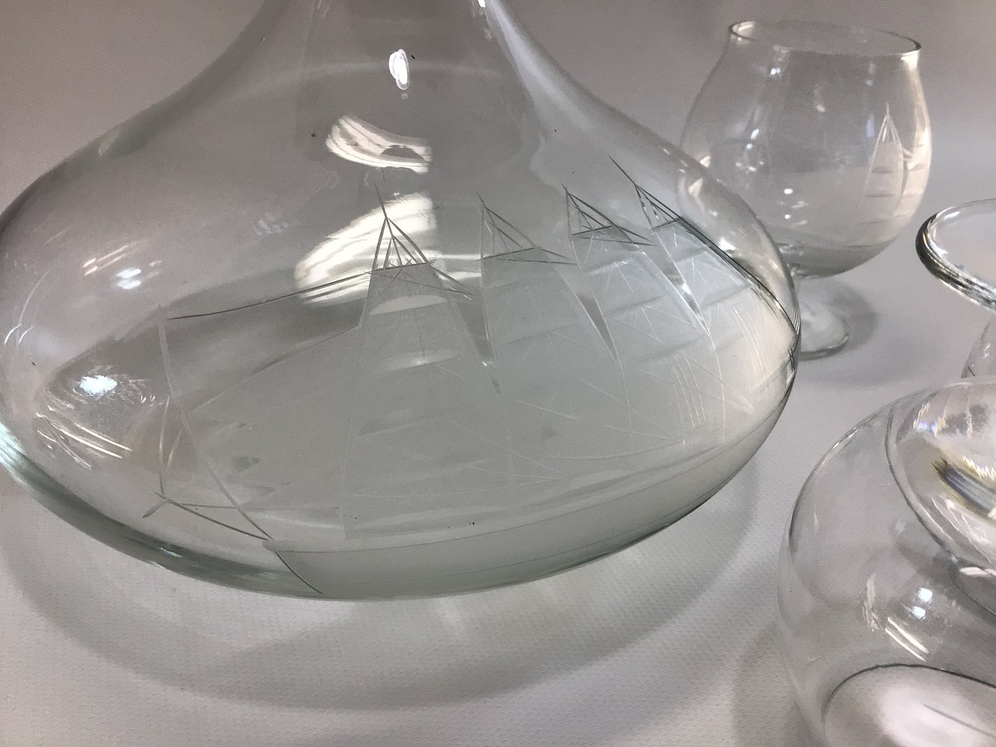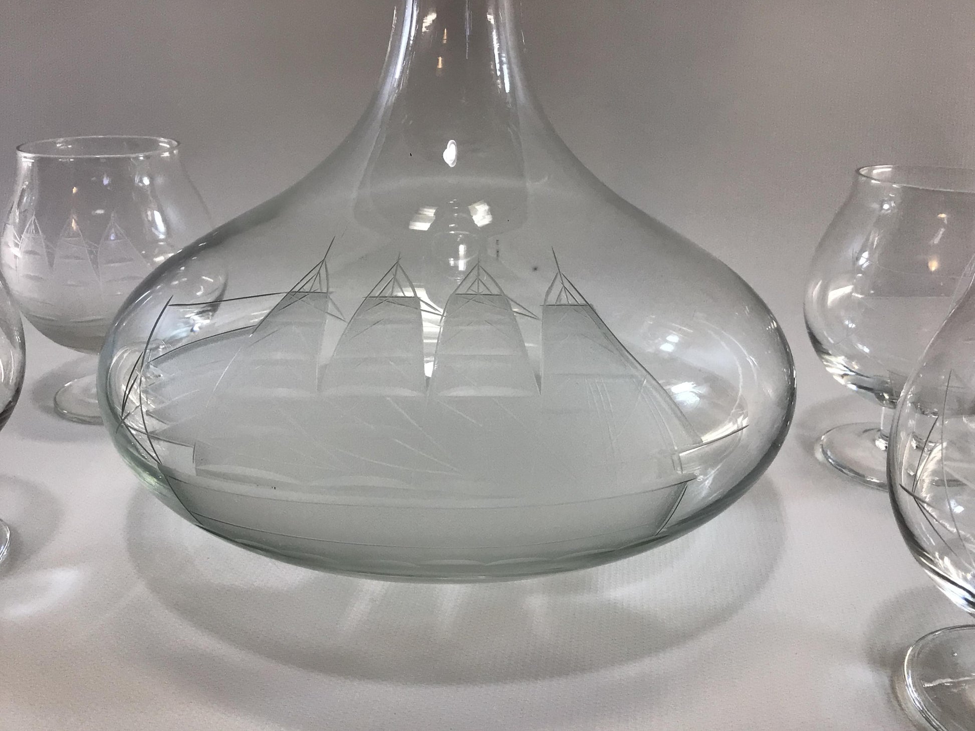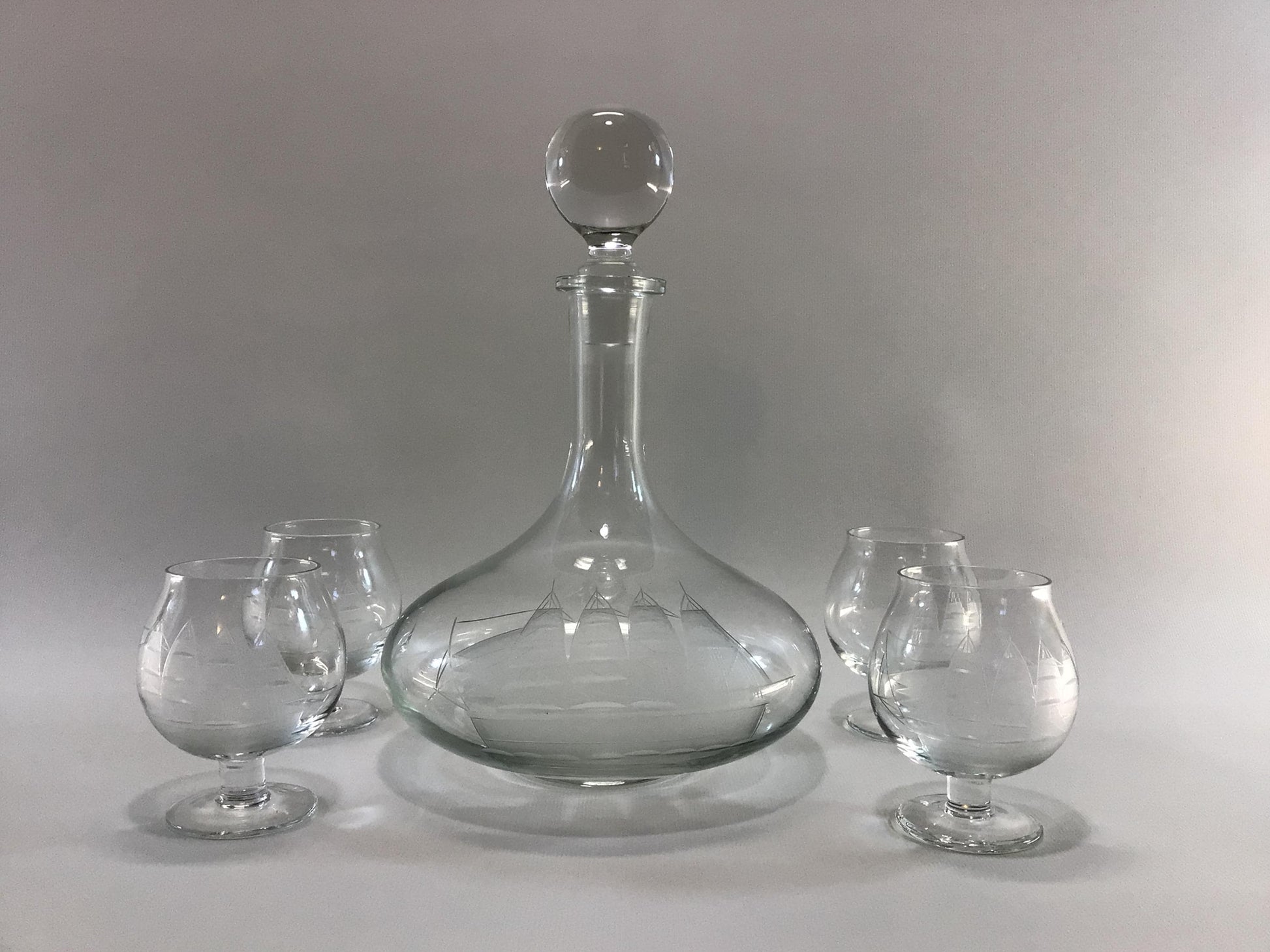Brandy Decanter Set Clipper Ship Nautical Theme Vintage Etched Toscany 4 fl oz Snifters