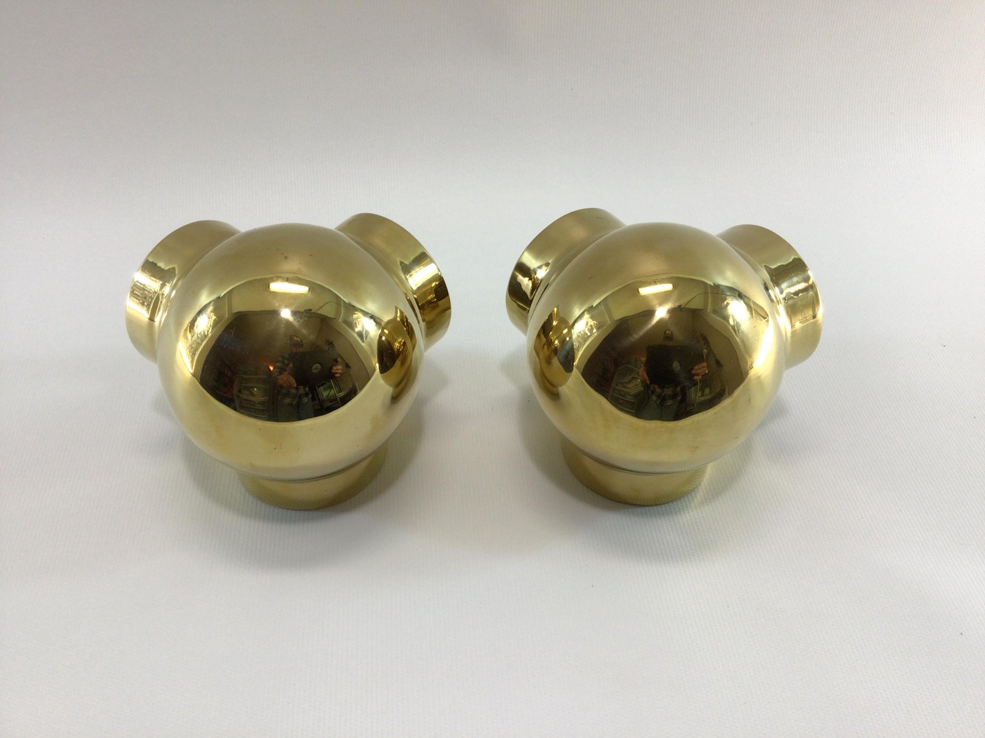 Pieces are in good condition, pieces are older vintage stock with some oxidation tarnishing patina, they could use a light polishing. Two of the brass screws are missing. Inside diameter of the pieces is 2".