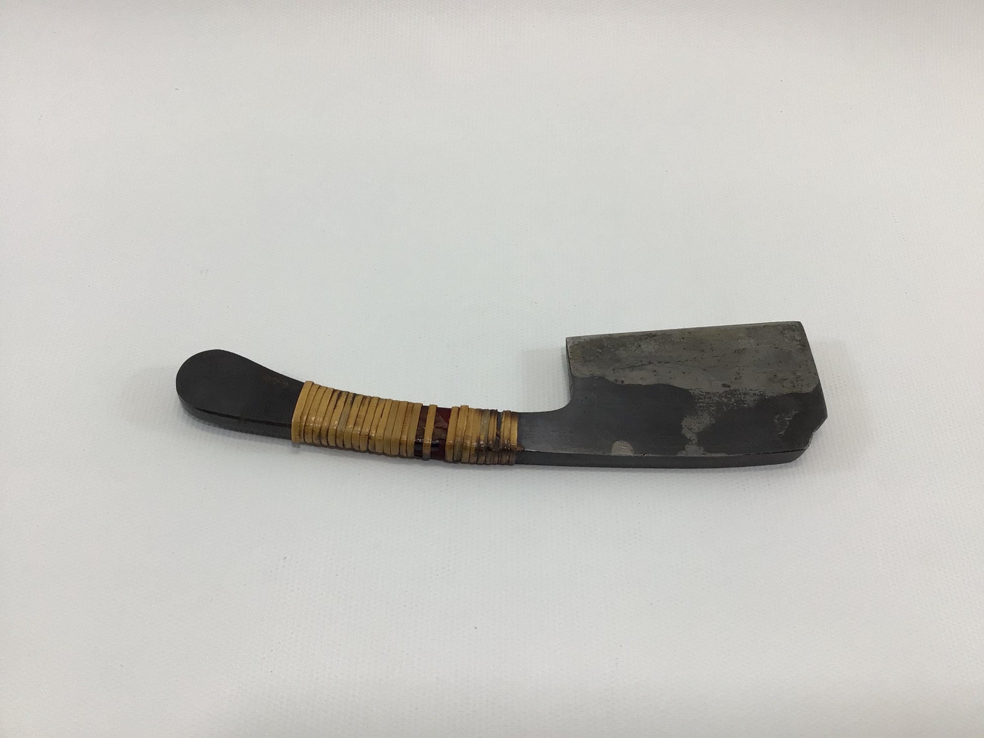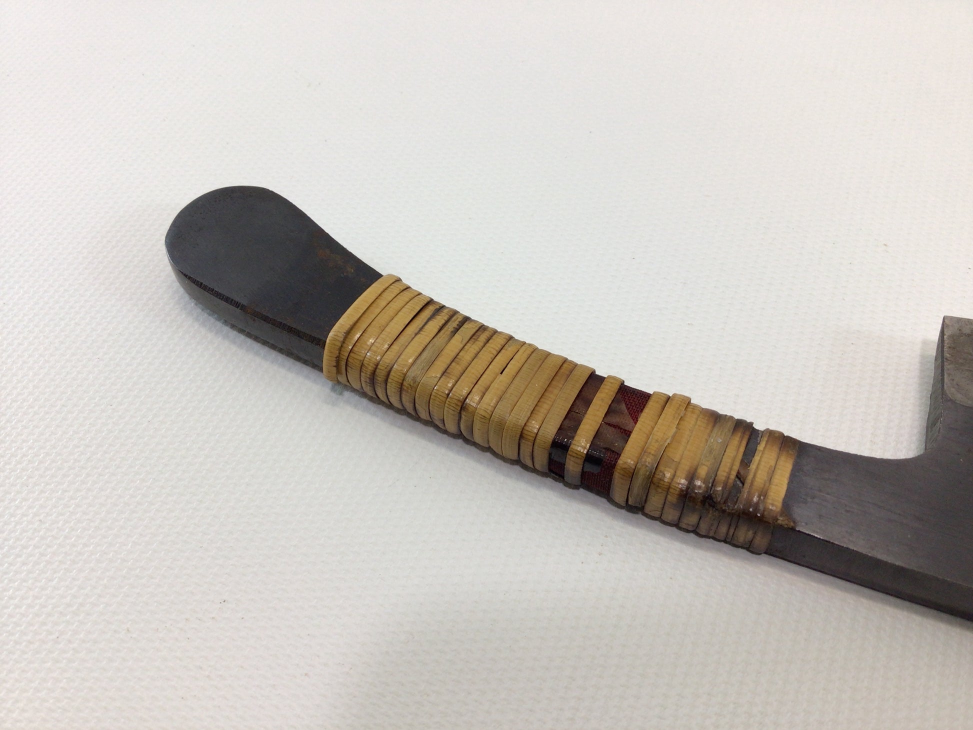 Nata is in good sharp condition, with some blade oxidation spots. Bamboo handle wrapping is broken and loose in spots. It measures approx. 7 1/4" long, blade width is approx. 1 3/4".