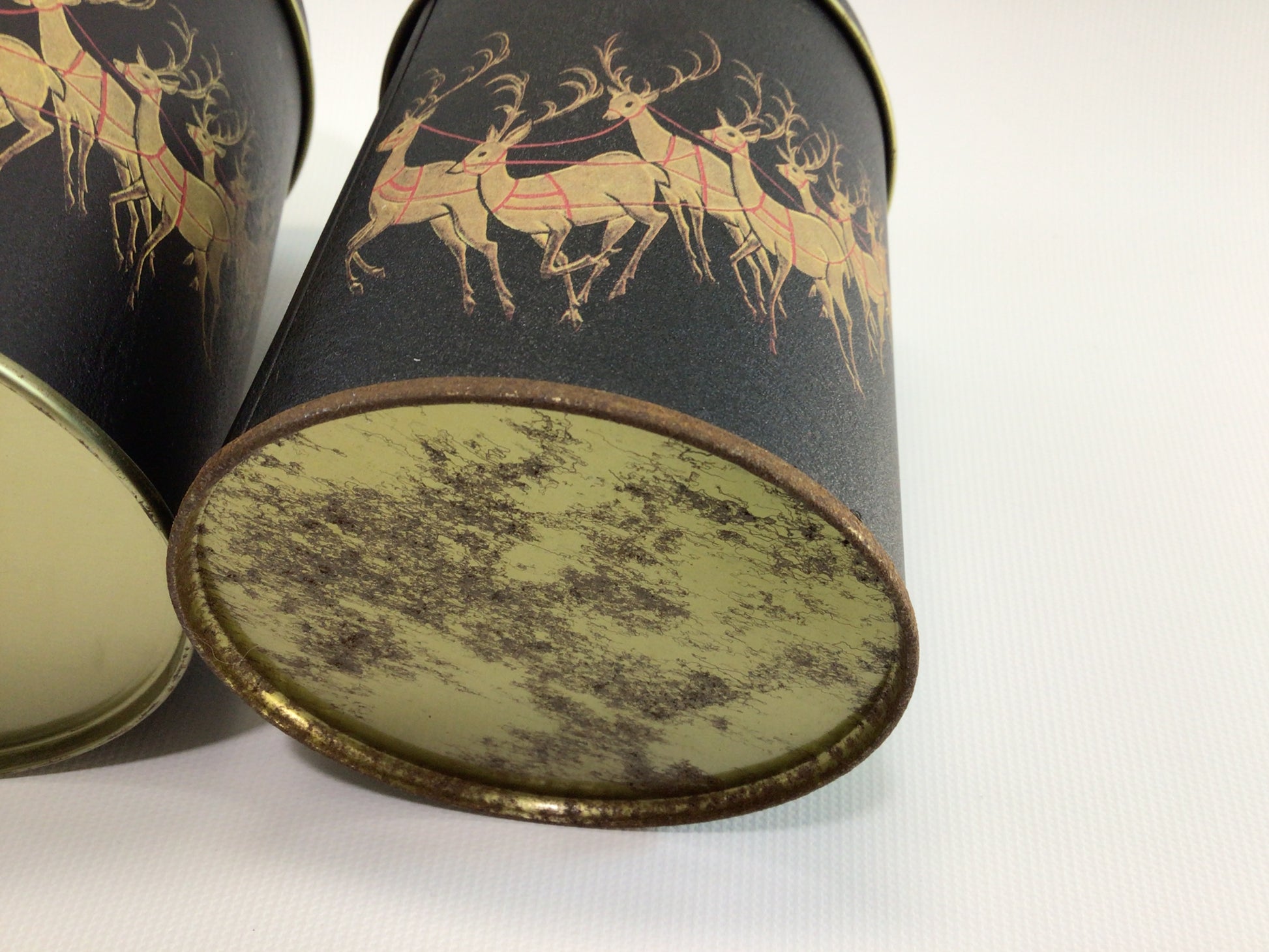 Tins are in fair condition with some use wear scuffs and scratches, the smallest has considerable rusting around its bottom rim. Largest can measures approx. 4 3/4" diameter x 5 7/8" tall.