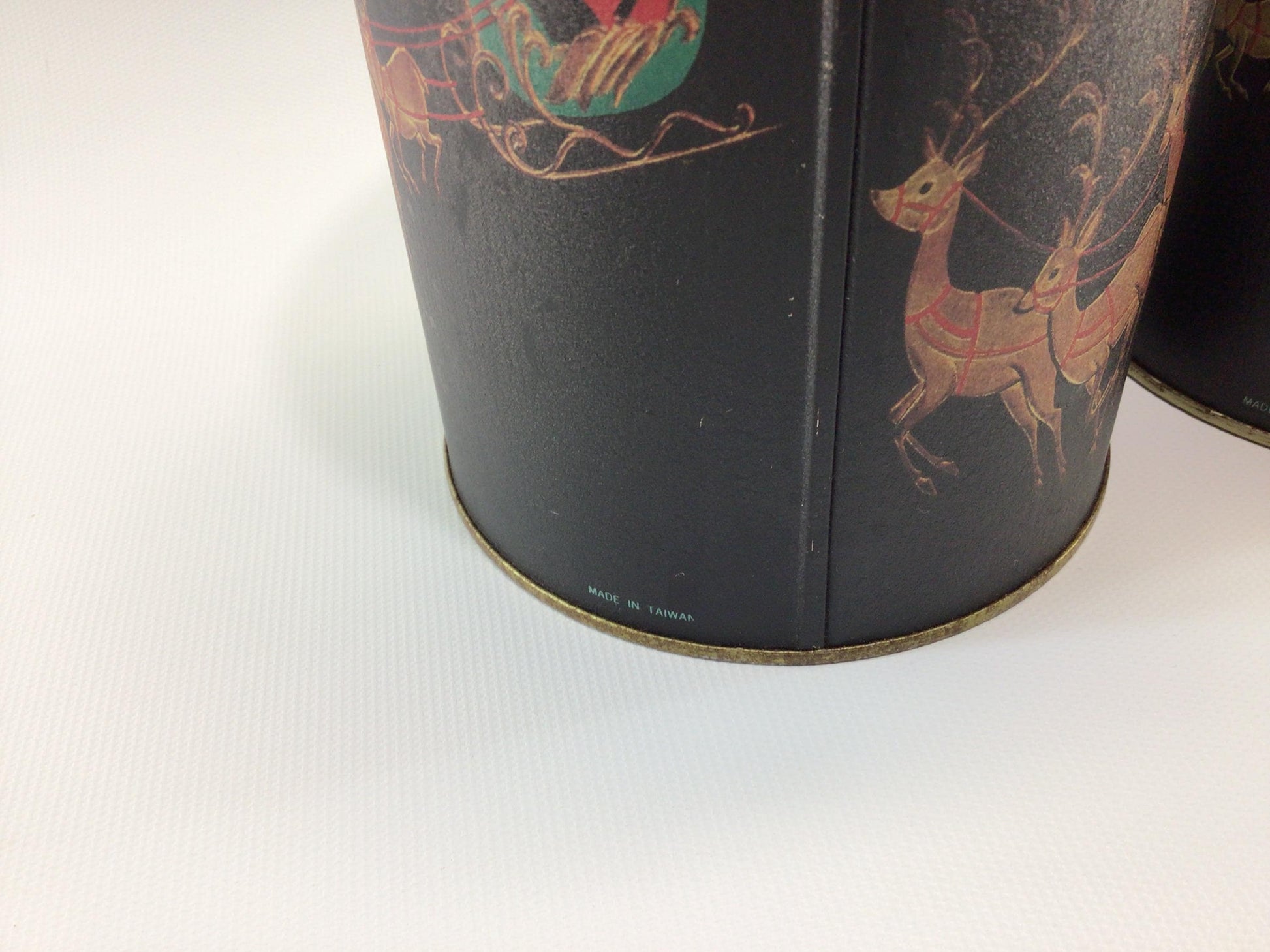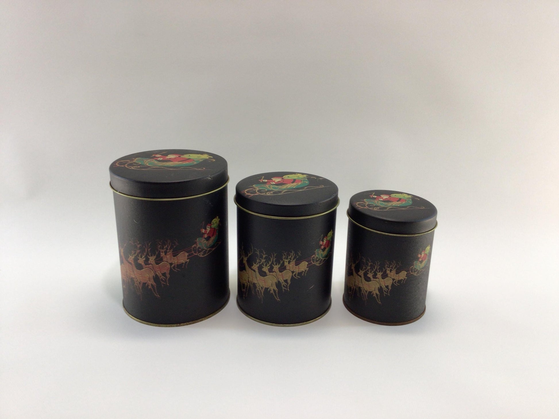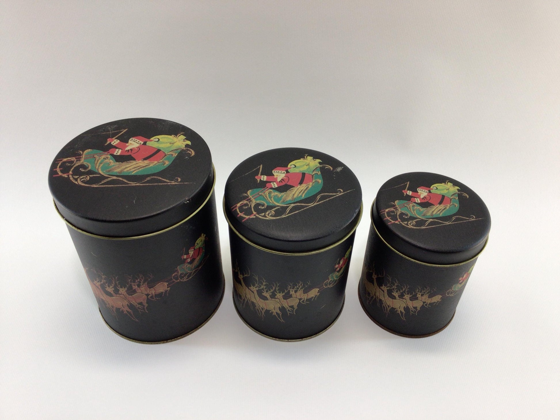 Christmas Eve Nesting 3 Piece Tin Canister Set Vintage Made in Taiwan Holiday Storage Containers.