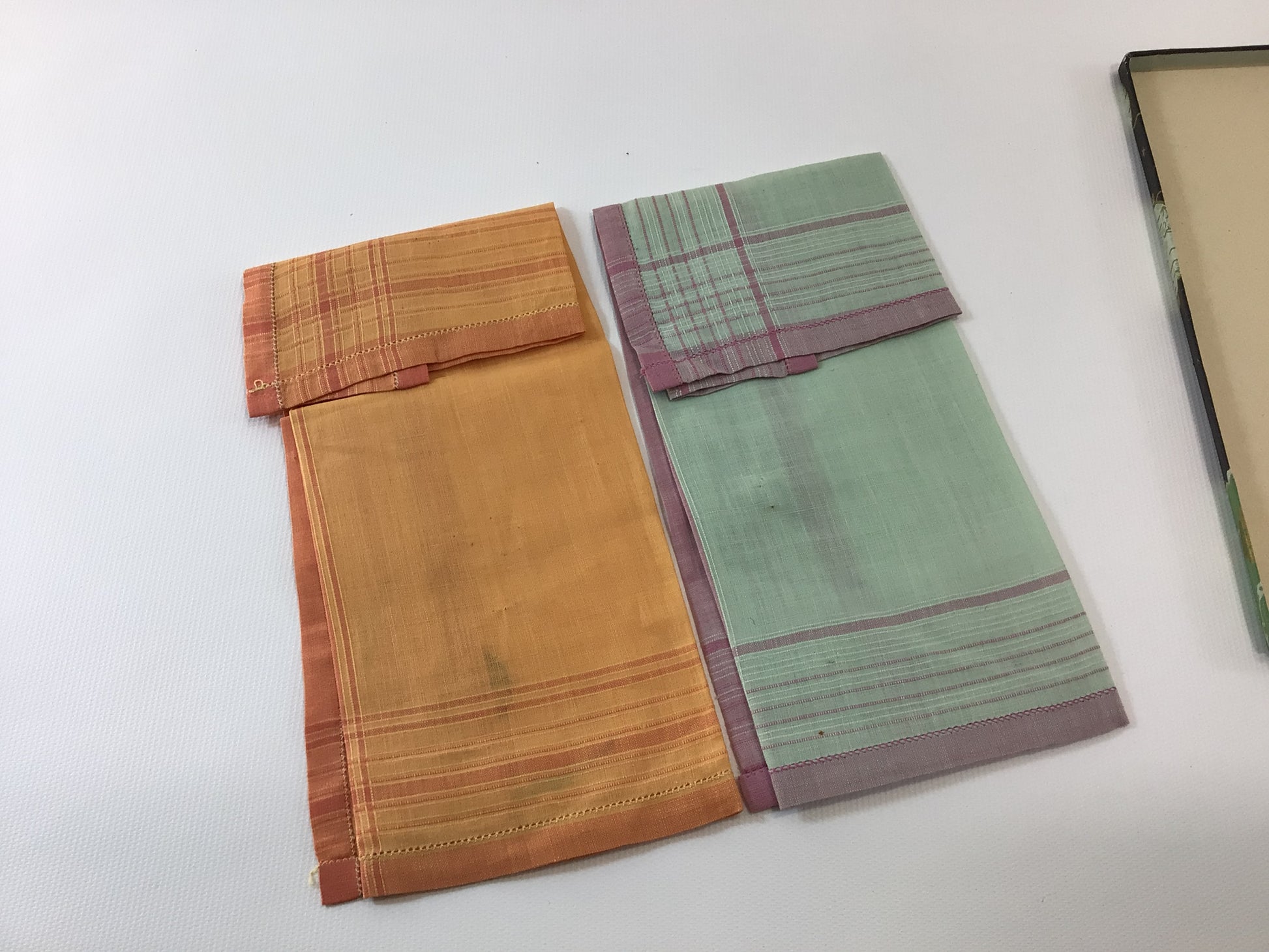 Handkerchiefs are in fair condition, they have some age staining.