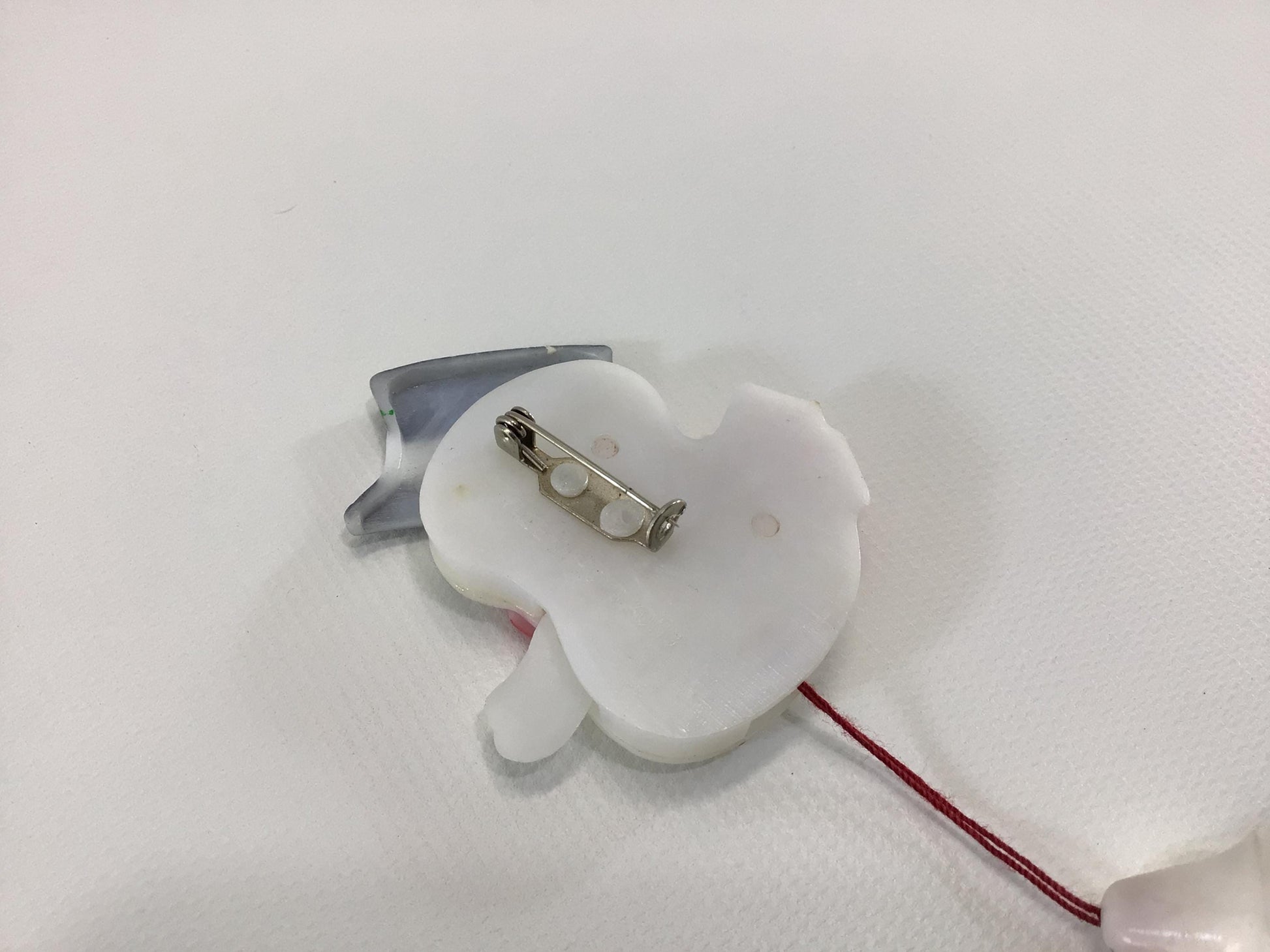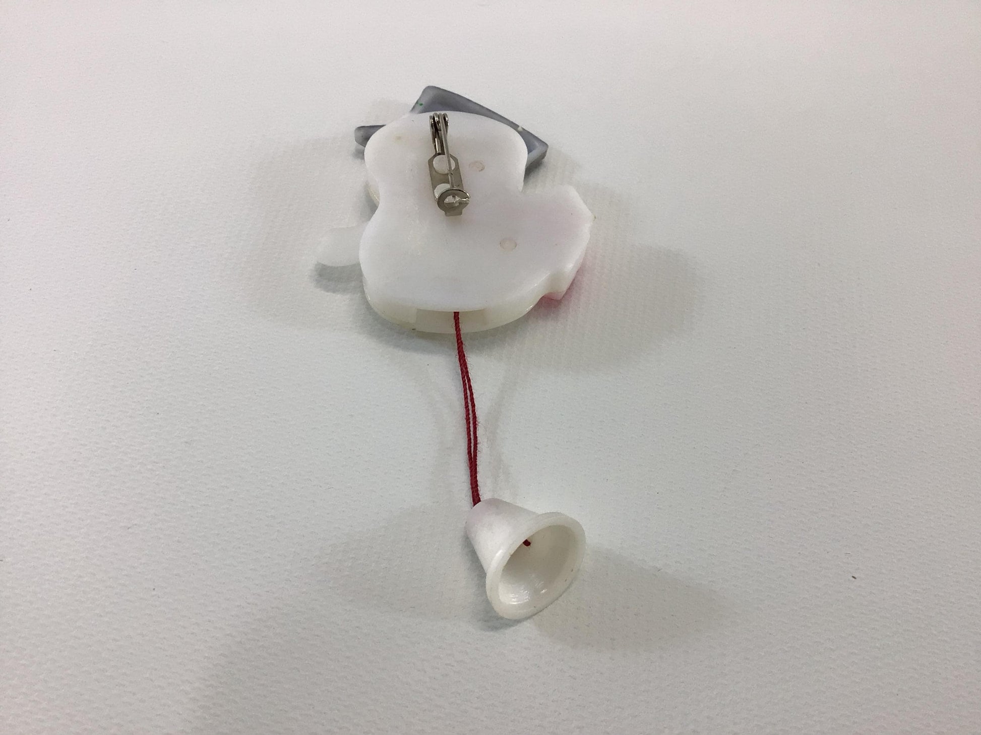 A cute kitschy holiday brooch in fair condition, could use a cleaning and its mechanism works rough (string does not retract on its own).
