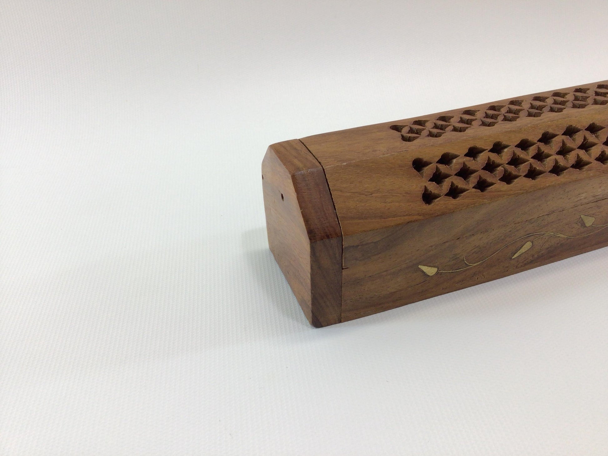 Incense Box Burner Vintage Hardwood and Brass Inlay Leaves for 9" Stick Incense.