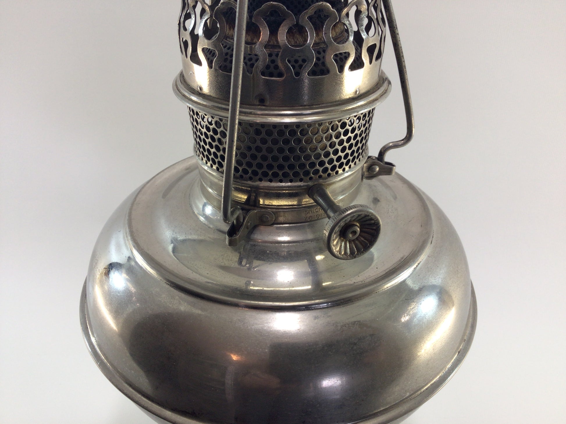 Lamp is in fair condition with considerable finish loss, fuel cap damaged and stuck closed.
