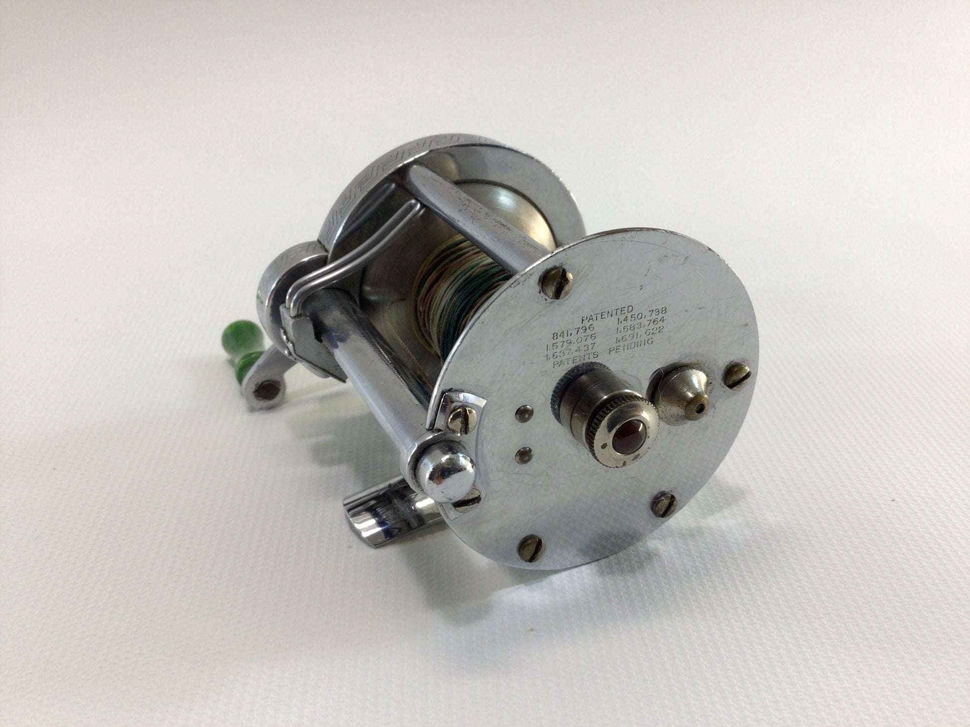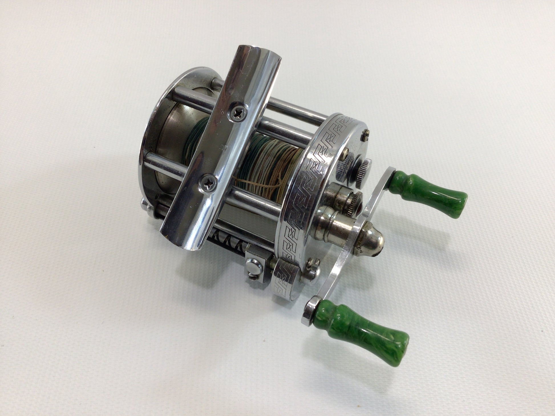 Reel is in good working condition with use wear scuffs, scratches and oxidation on some metal components. Box is worn with a broken bottom and loose label.