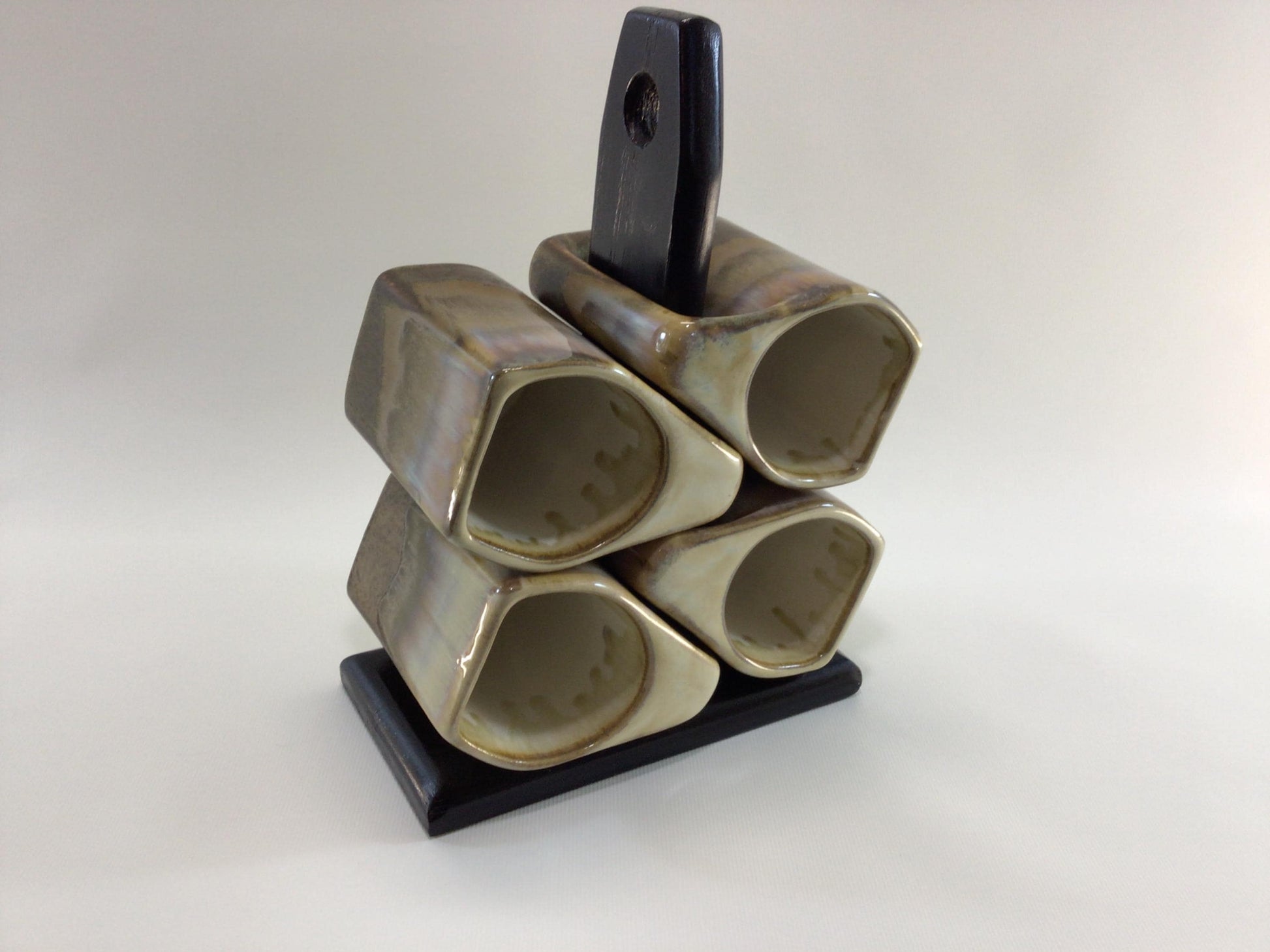 Set of mugs is in good condition, no chips. Tower stand has use wear scuffs with touch ups, it measures approx. 11" high x 7 7/8" across x 4 1/4" wide.