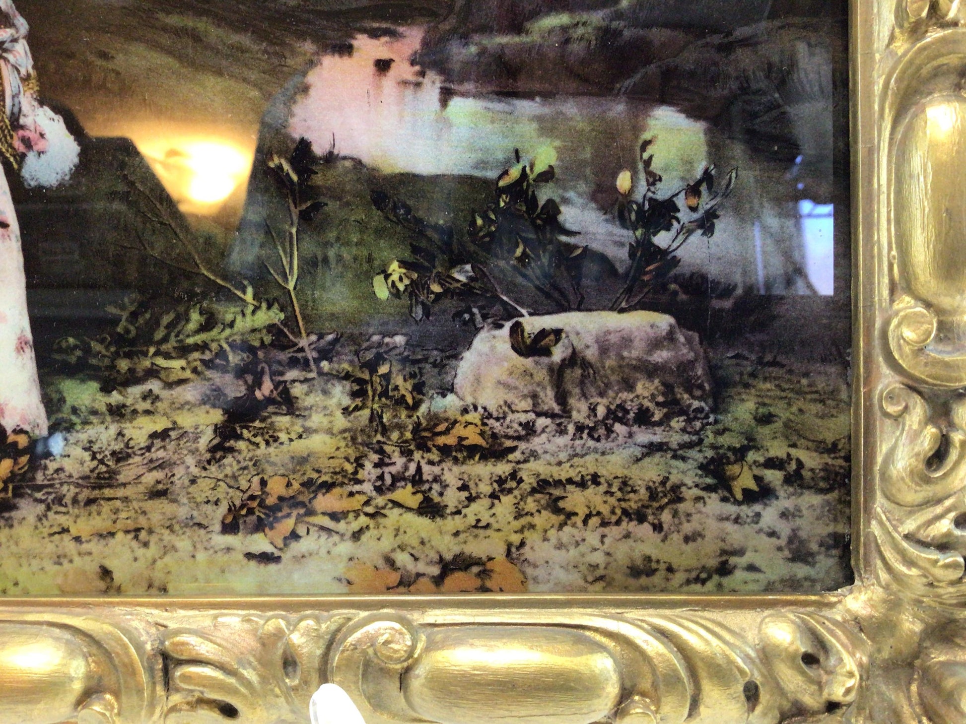 Reverse Painted Chalkware Frame Antique Art Wall Decor Young Woman at Stream Adorned in Pink Roses.