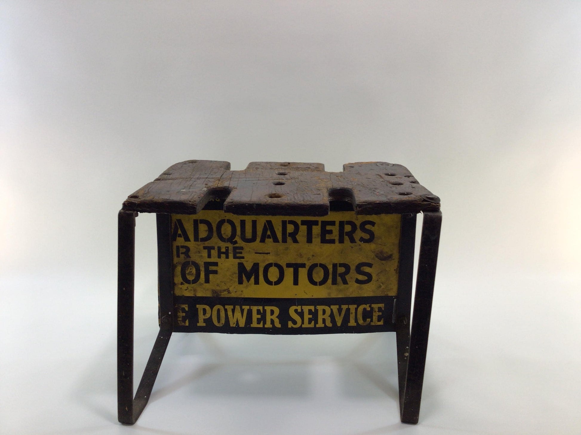 Rustic Handmade Garage Stool Tool Holder with Partial Metal Advertising Sign Perfect Circle Piston Rings Richmond Indiana