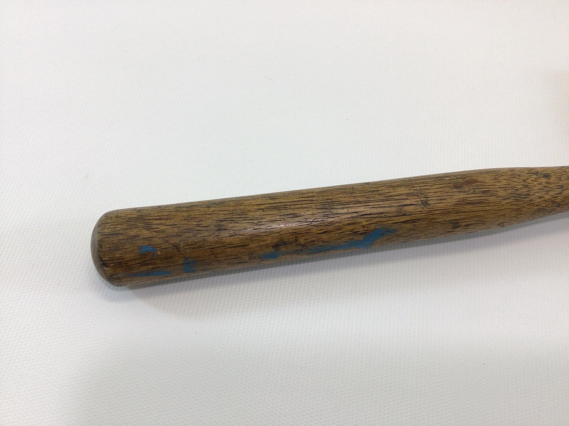Has use wear age patina, oxidation rusting, dings and blue paint on the head and handle.