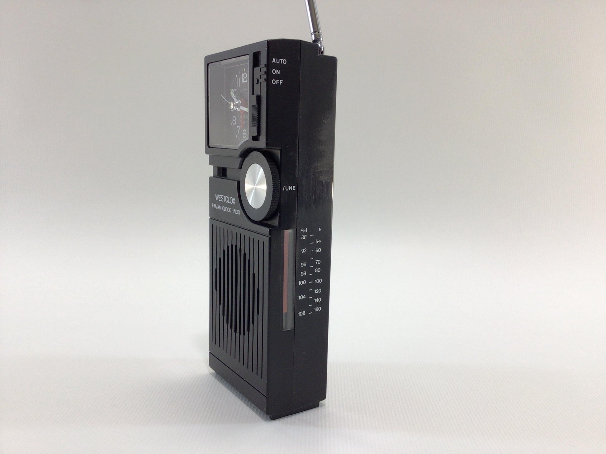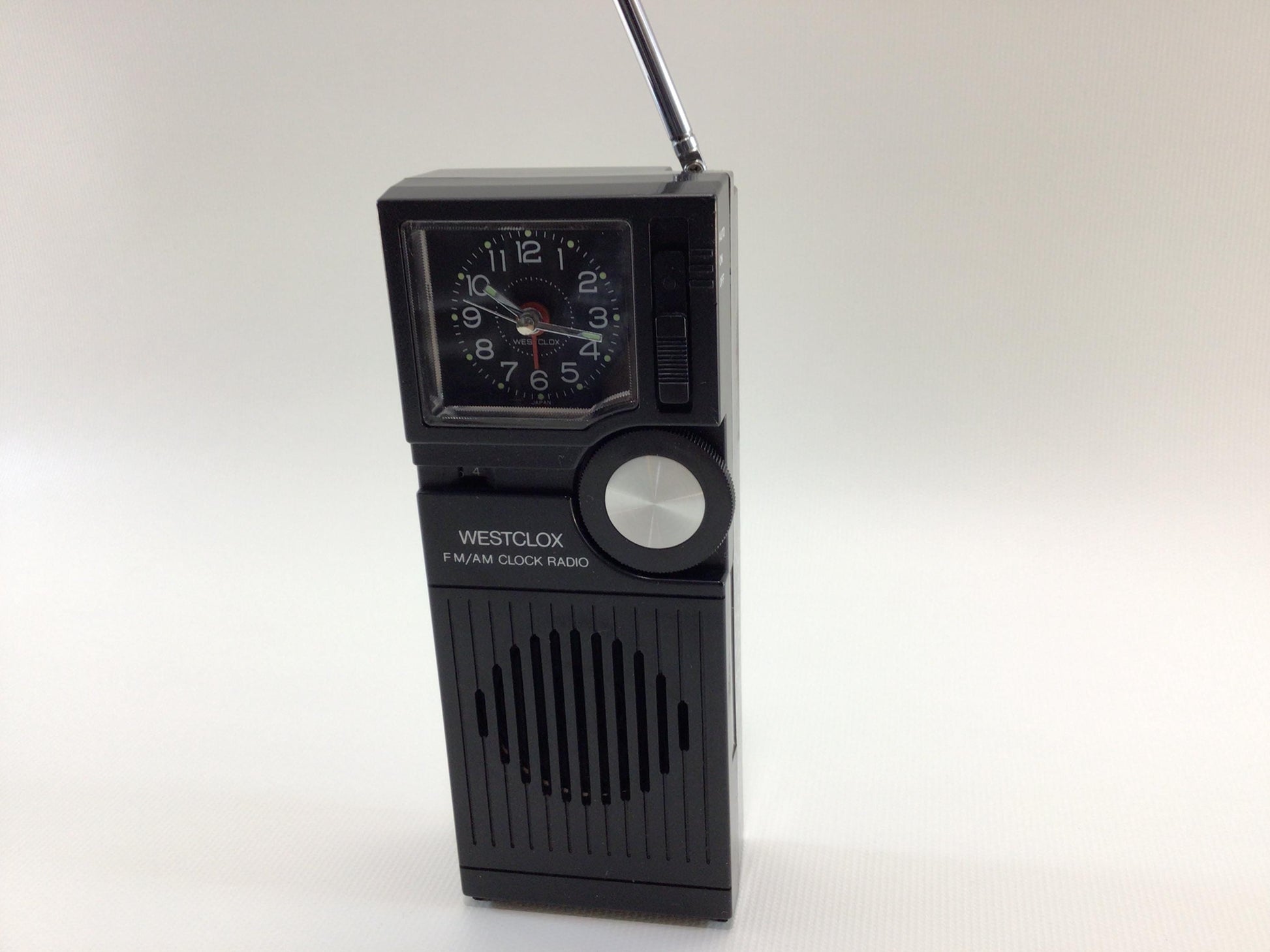 Radio is in good cosmetic condition with some use wear scuffing. The radio does not work, clock and alarm do work. Unit measures approx. 2 1/4" wide x 5 3/4" high.