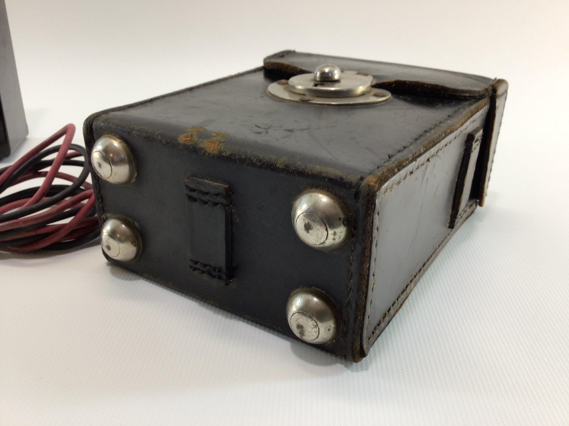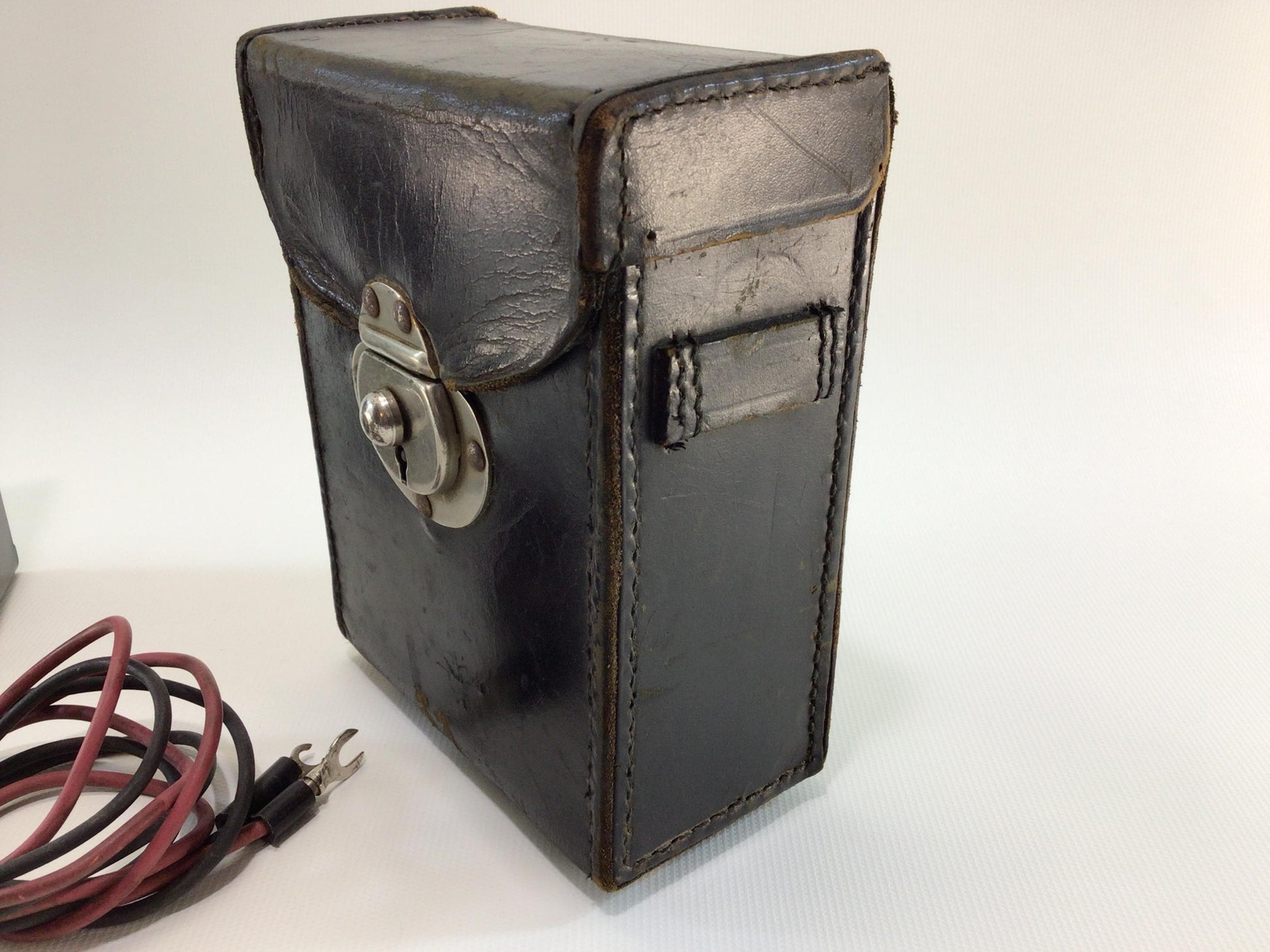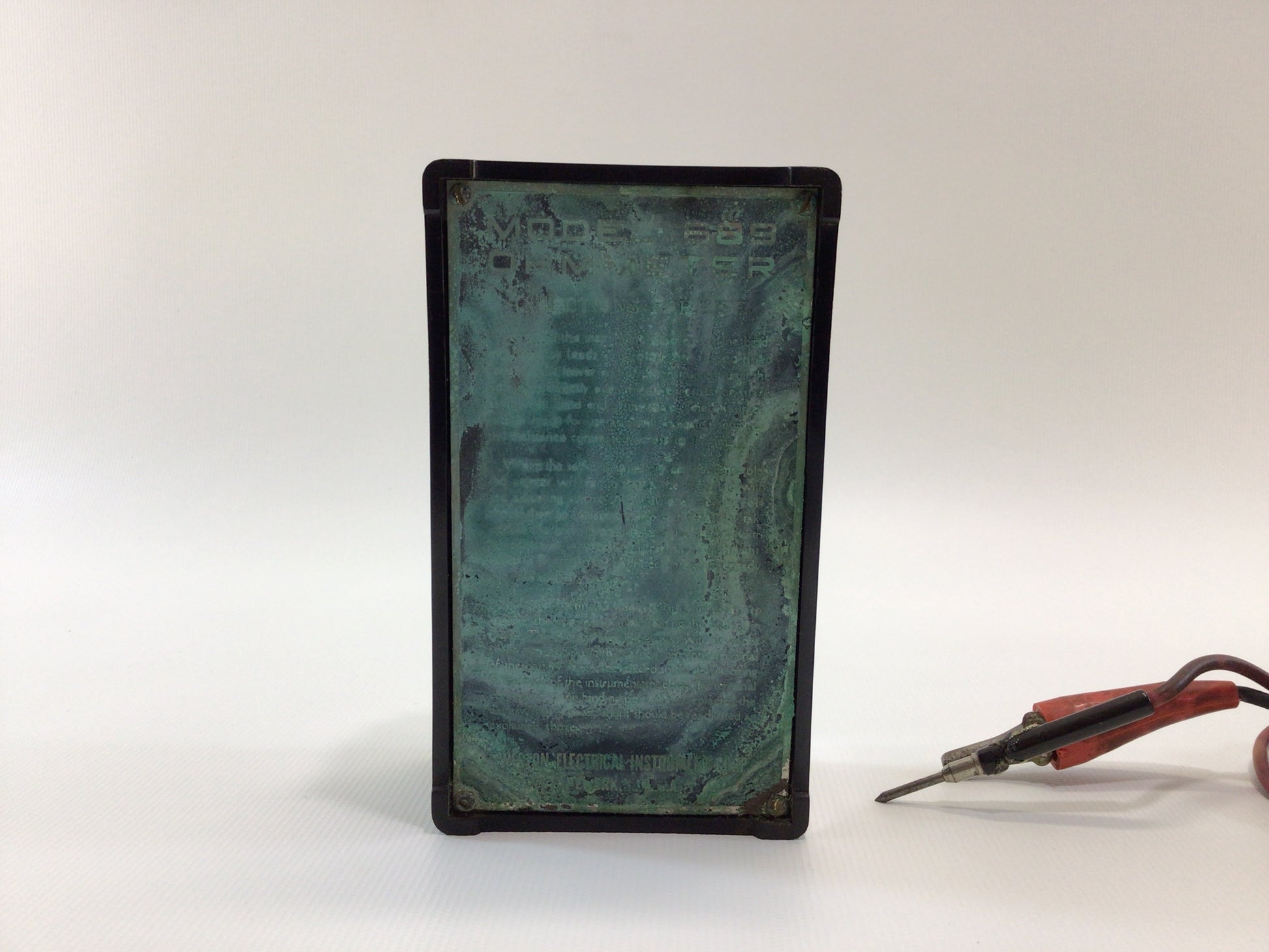 An old ohmmeter in untested condition, body has use wear scuffs, scratches, back panel and interior have acid corrosion. Black leather case measures approx. 5 3/4" high x 4 5/8" wide x 2 1/2" deep.